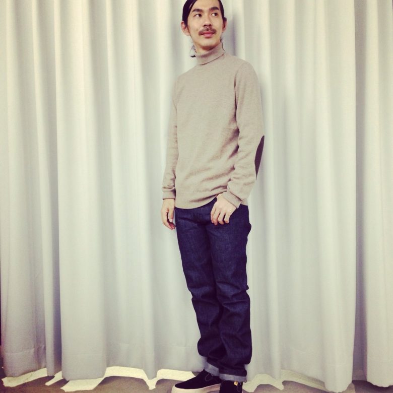 綺麗なベージュのタートルネックは一枚で見栄えしシンプルに大人の雰囲気に。