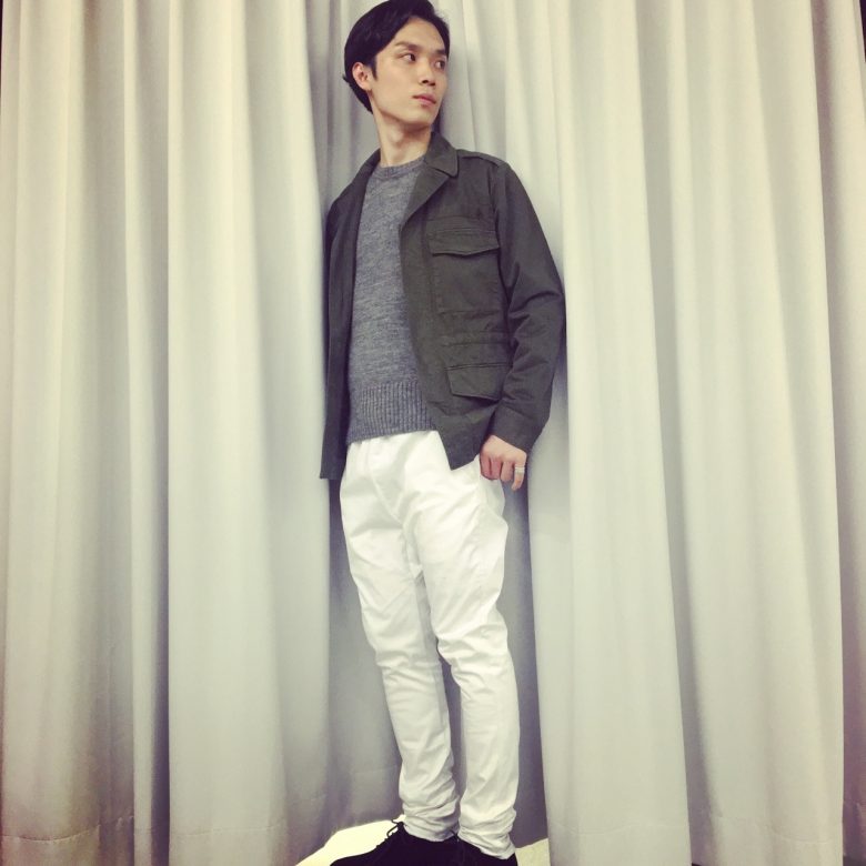 ホワイトのパンツでも独特のシルエットとミリタリージャケットでコンサバティブになりすぎないスタイリングに。