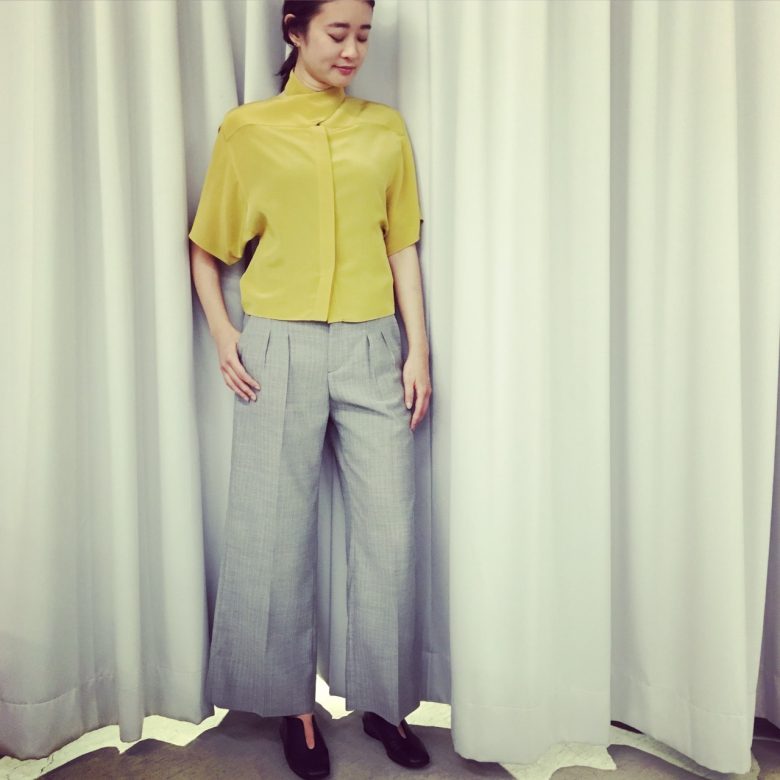 MargielaのPRE FALLより、エレガントなシルエットが際立つアイテムの登場。シルク素材で光沢のある上品なマスタードカラーが目を引きます。