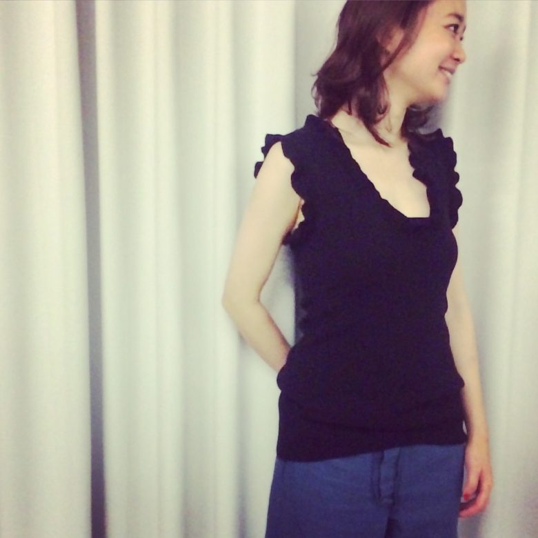 ヴァージンウールを使用したリブニットは襟ぐりのフリルに女心をくすぐられます。
