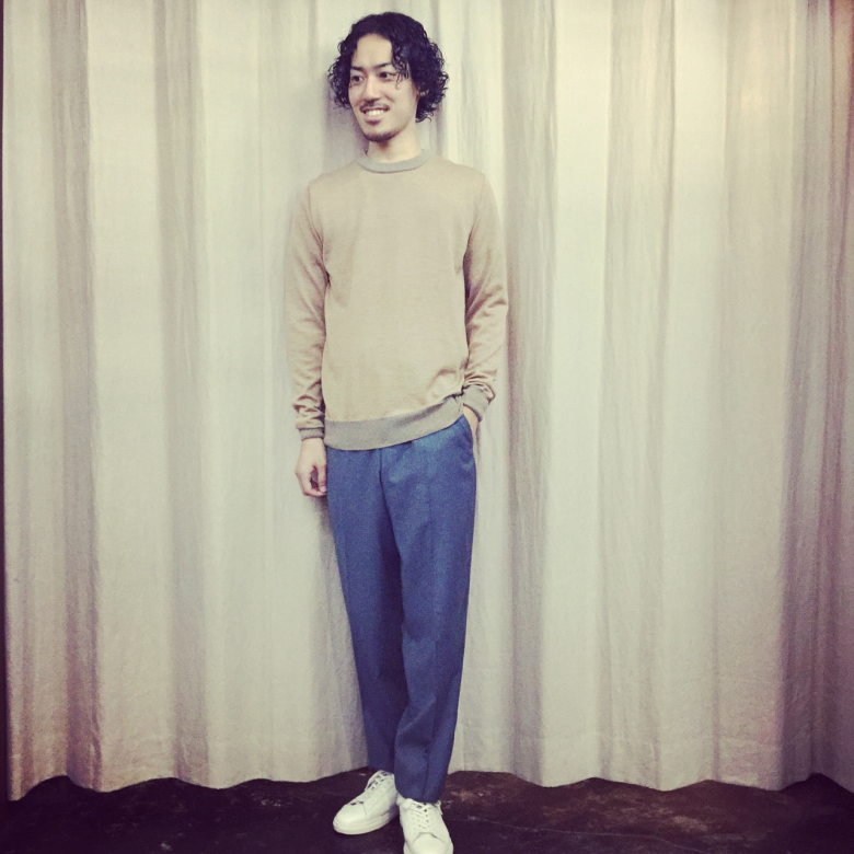 上質なウールを使用したクルーネックニットは秋冬らしい柔らかなカラーリングが◎