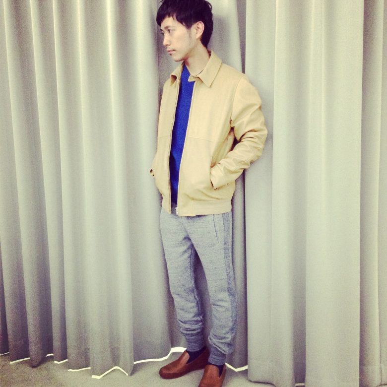 MELINDAGLOSS定番のレザーブルゾン。鮮やかなブルーのニットと、スウェットパンツで是非。