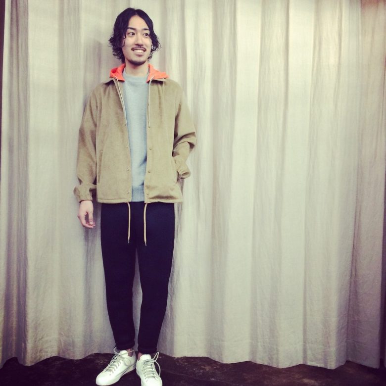シンセティックヌバックにパンチング加工が施されたコーチジャケットは、程良い生地感と柔らかな肌触りで春先に大活躍の一着です‼︎