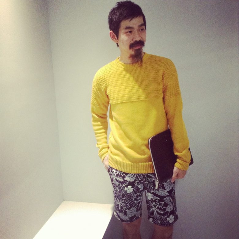 トップスは薄手で発色の良いコットンニットとなります。ショーツは柄物で足元はスニーカーがオススメです。