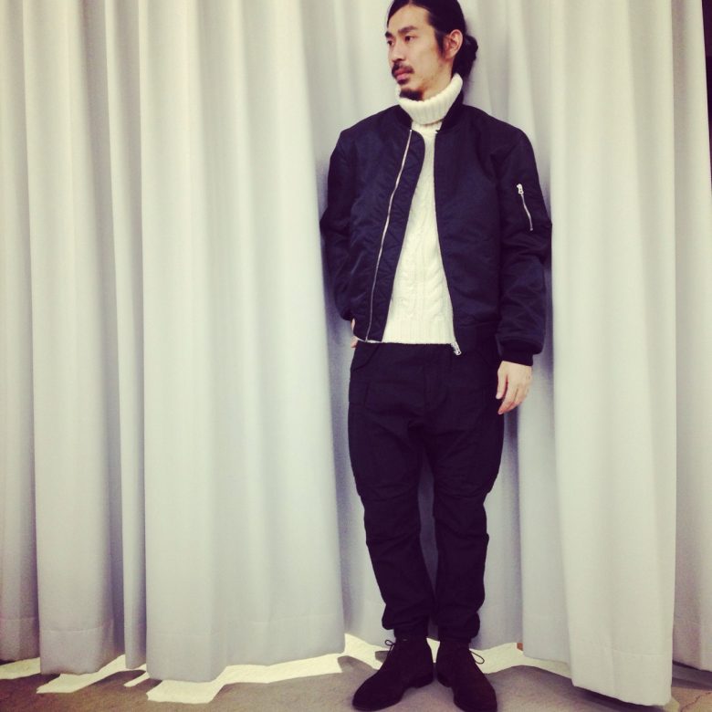 28.11.2015 NLST ma1 fright jacket price…85,000+tax size…S,M ネイビーの光沢感があるMA1は綺麗目なニットとのスタイリングで!緩いシルエットはパンツでバランスを! nlst