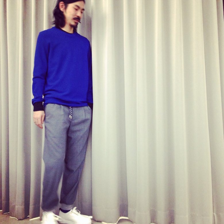 発色の良いブルーをアクセントにシンプルなスタイリングで。