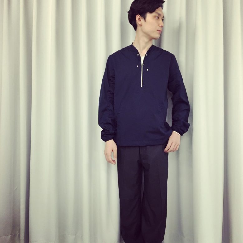 一見スポーティーなプルオーバーもシャンブレーのワイドパンツで上品なスタイリングに。