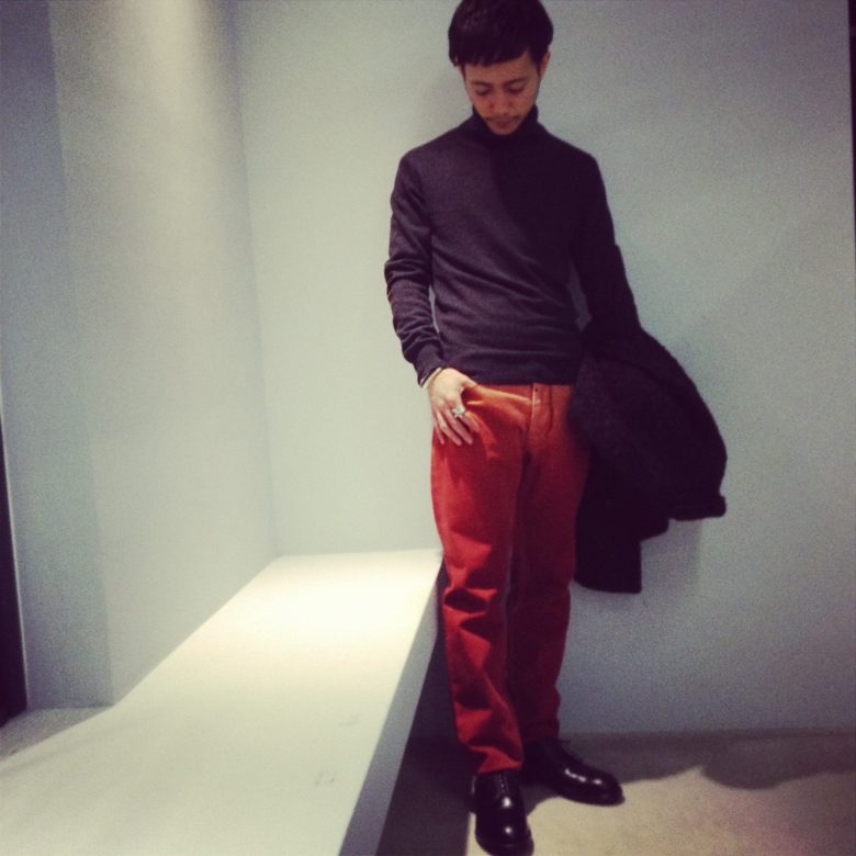 上質なカシミヤのニットグラデーション染めのデニムを合わせて遊びの効いたコーディネートに。
