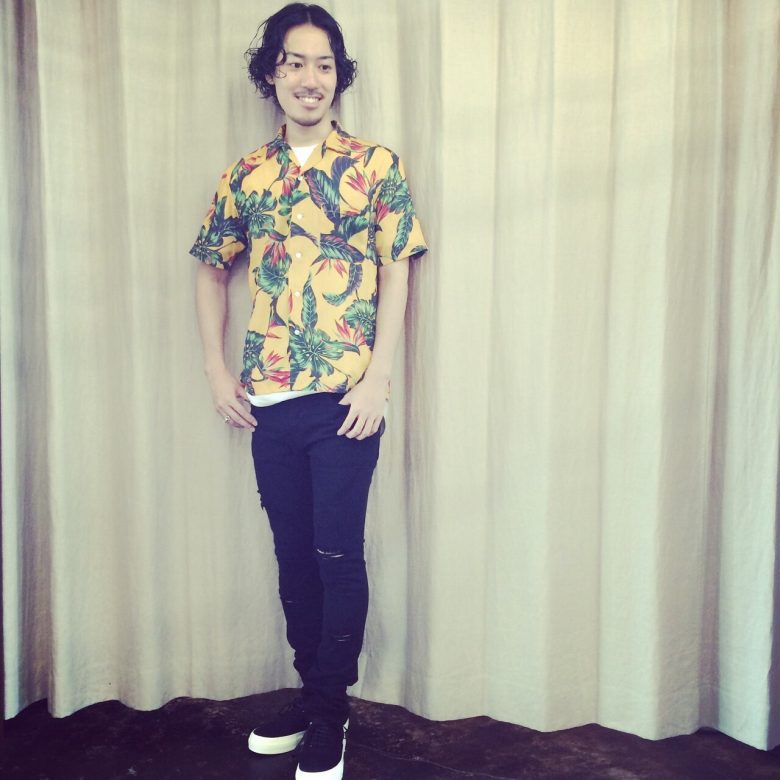 アロハプリントがインパクト大のシャツはポリエステル素材で着心地も◎