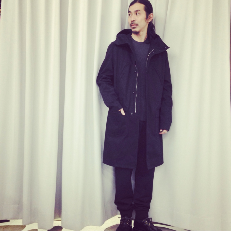 ラフシモンズのコートはデザイン性に加えて生地感もおすすめです。オールブラックでモード感を。