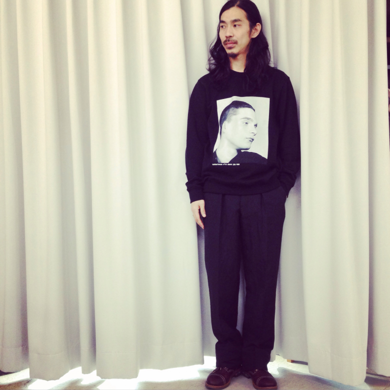 ラフシモンズの上質なスウェットは着心地と、インパクトのあるプリントが印象的です!スラックスとのスタイリングを。