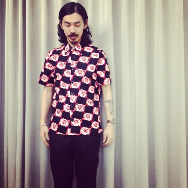 厚手の生地を使用したシャツはスラックス地のパンツと。特徴的なデザインは一枚で見栄えします。