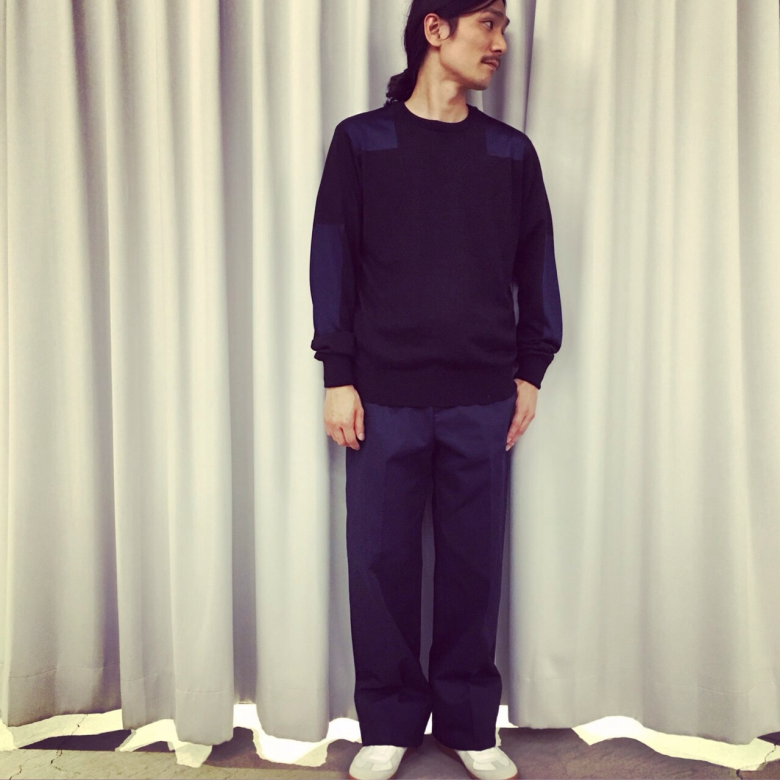 方と肘が切替になったなハイゲージニット。綺麗な表情で、ワイドシルエットのパンツと合わせたい一枚。