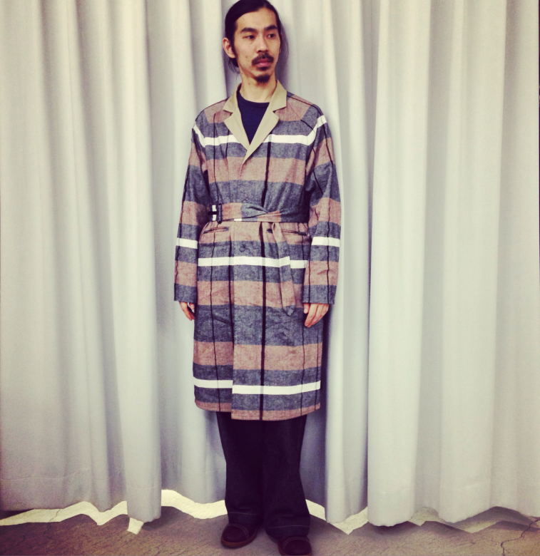 チェックとベージュのリバーシブルコートとなります!ウエストのベルトでシルエットに変化を!