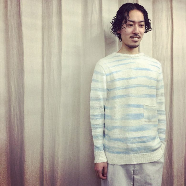淡く柔らかなボーダーラインが良い雰囲気のニットはお馴染みのカシミヤ素材で着心地も抜群です‼︎