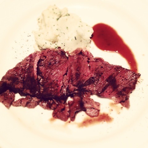 Charcoal grilled chuck eye log redwine sauce with Lily bulb and sage mushed potatoes