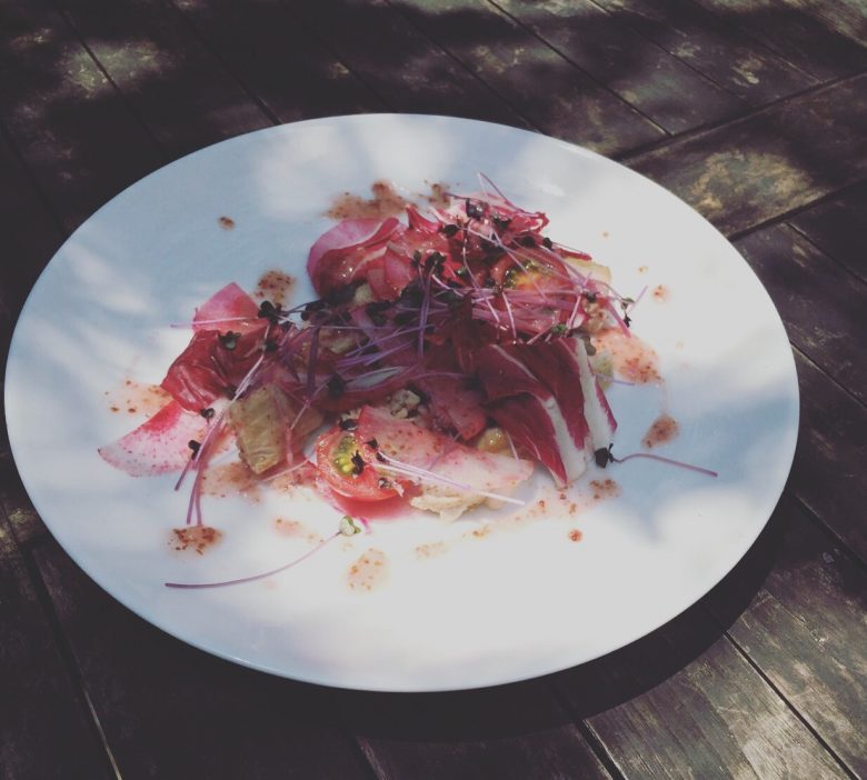 Charcoal Rare Grilled Tuna Topped with Red Color Vegetables Salad