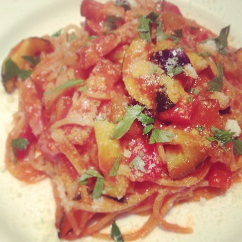 Spaghetti summer vegetables napolitana and homemade salssisia