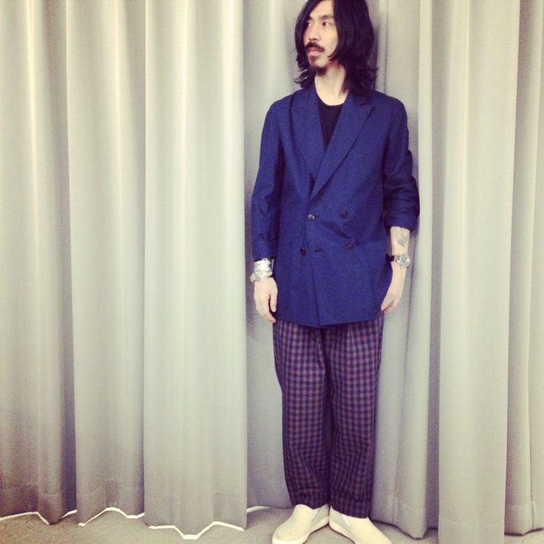 ダブルのコットンJKはシンプルにカットソーとのスタイリングがおすすめです。ワイドパンツでリラックス感を!