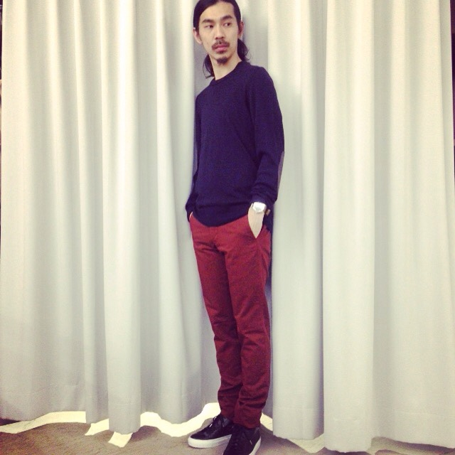生地の張りも良くシルエットはタイトなパンツはコードバンのカラーが新鮮です!ネイビーとのトップスで。