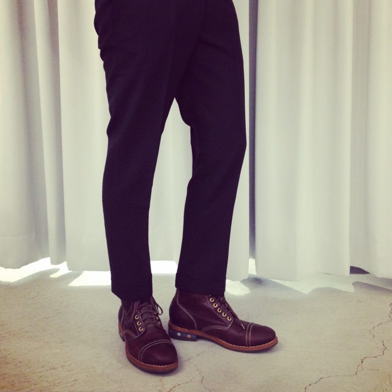 腰回りにはアジャスターを備え立体感のあるシルエットとなります。足に馴染む上質な生地を是非。